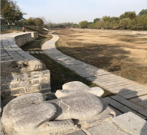 纵目望去,在4000余平方米经过勘探和发掘的遗址上,大部分是废弃的河床、河岸和由原来的水闸改成的旱桥,及西岸建筑群遗址上残存的石碑、石础、石柱和零星的建筑物等。眼前的一切,相对于来之前对南旺分水枢纽活色生香的构想,多少令我有些心理落差。